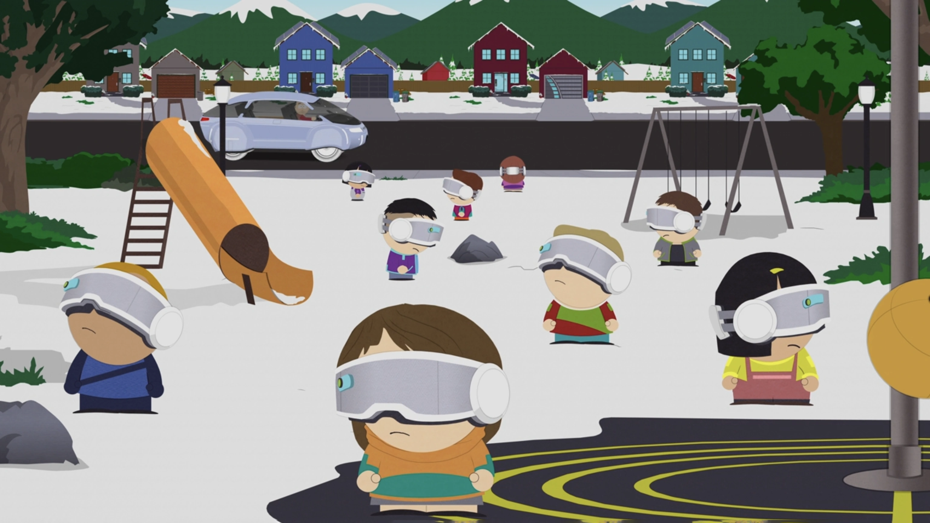 Als Stan zurück nach South Park fährt, erwähnt er gegenüber seiner Alexa, dass er sich mies fühle, bevor er an Palmen, dem fast gänzlich ausgetrockneten "Stark's Puddle", einer erweiterten "South Park Grundschule Plus", der nun geschlossenen Park County Polizeistation, sowie einer Vielzahl an neuen Geschäften wie einem Hundeaugenarzt und Kindern auf Hoverboards mit Virtual Reality Brillen aufgesetzt vorbeifährt. Stan erreicht "Denny's Applebee's Max", um sich dort mit Kyle zu treffen. Ein Kellner erklärt, das Restaurant serviere kein Fleisch mehr in der Zukunft, sondern nur Nahrung aus nachhaltigen Insektenproteinen. Kyle sagt, dass er mit Kenny in Kontakt war, welcher Nachforschungen tätigte, wer für die neulichen Ereignisse verantwortlich war. Tolkien Black kommt hinzu und zeigt eine Auszeichnung seiner Karriere bei der Strafverfolgung. Kenny hatte beiden erzählt, dass er einen Durchbruch hatte, als er gestorben war. Stan verhöhnt die beiden, indem er vorschlägt, dass sie doch Jesus und den Weihnachtsmann um Hilfe bitten sollten. Zudem sagt er, dass sie Erwachsen werden sollen und er nur wegen der Beisetzung nach South Park gekommen war.