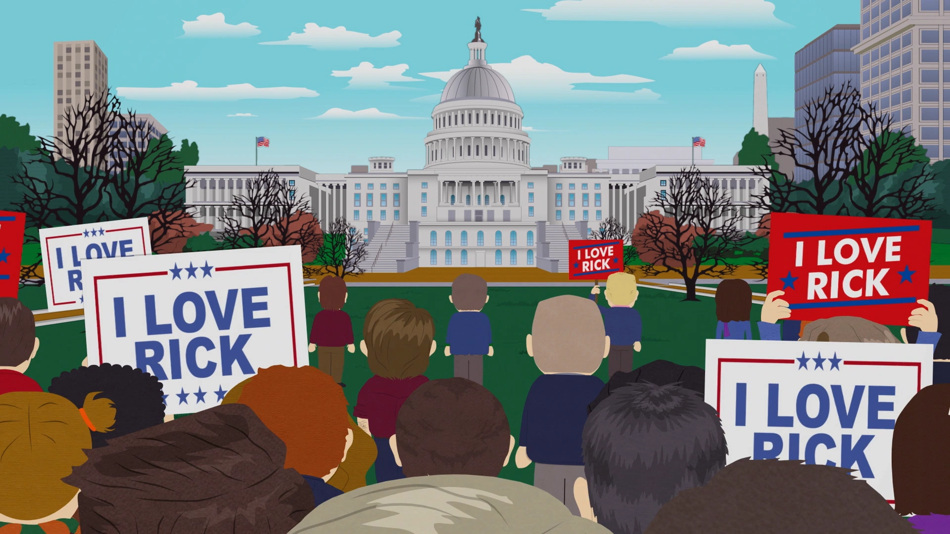 Die Massen beginnen, "Ich liebe Rick!" mit Garrison zu rufen und brechen daraufhin die Barrikaden und stürmen erneut zum Kapitol.