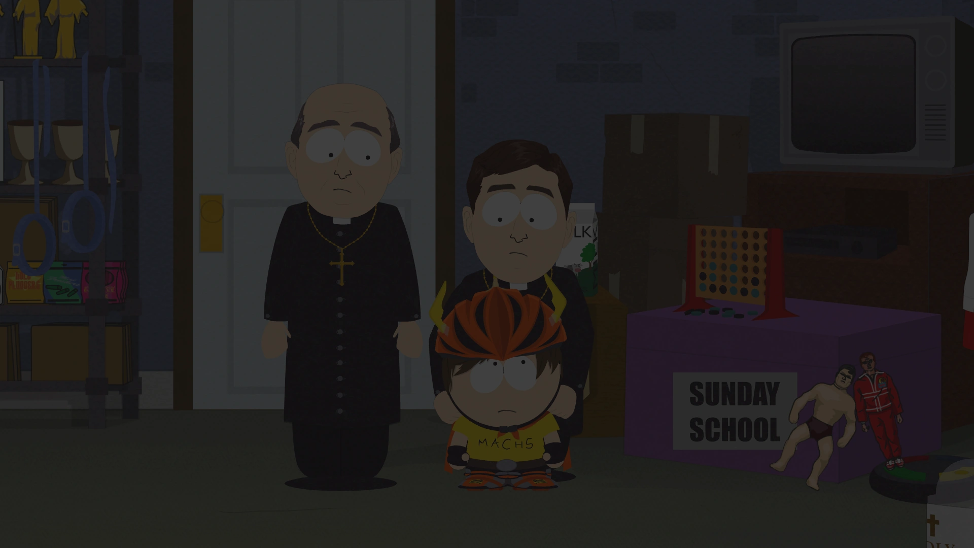 Le mot de passe est Agenouillez-vous devant Jésus. À l'intérieur de la salle de stockage, vous trouverez un nouvel artefact et un morceau de Creek Yaoi Art. N'oubliez pas de prendre un selfie avec Père Maxi pendant que vous êtes ici. Rendez-vous maintenant à l'École élémentaire de South Park pour The Talk.
