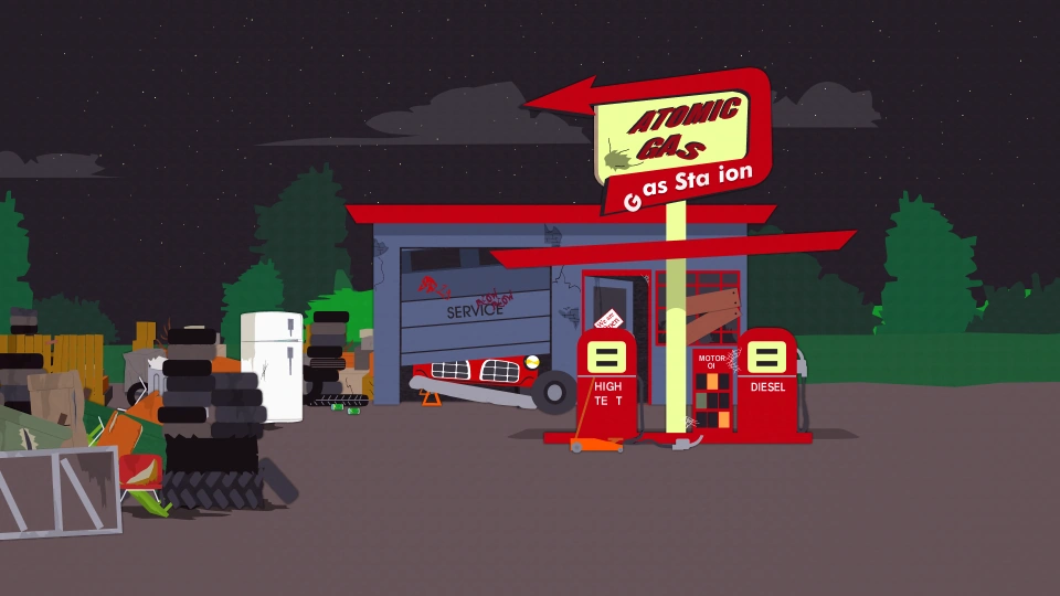 - Cet article est une version traduite de la page Atomic Gas Station disponible sur le wiki South Park anglophone du site Fandom et sous licence Creative Commons Attribution-Share Alike.