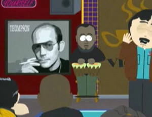 Une affiche de Thompson décore le mur du café Express Yourself, où Randy Marsh laisse échapper une certaine tension poétique dans l'épisode de la onzième saison "Avec nos excuses à Jesse Jackson".