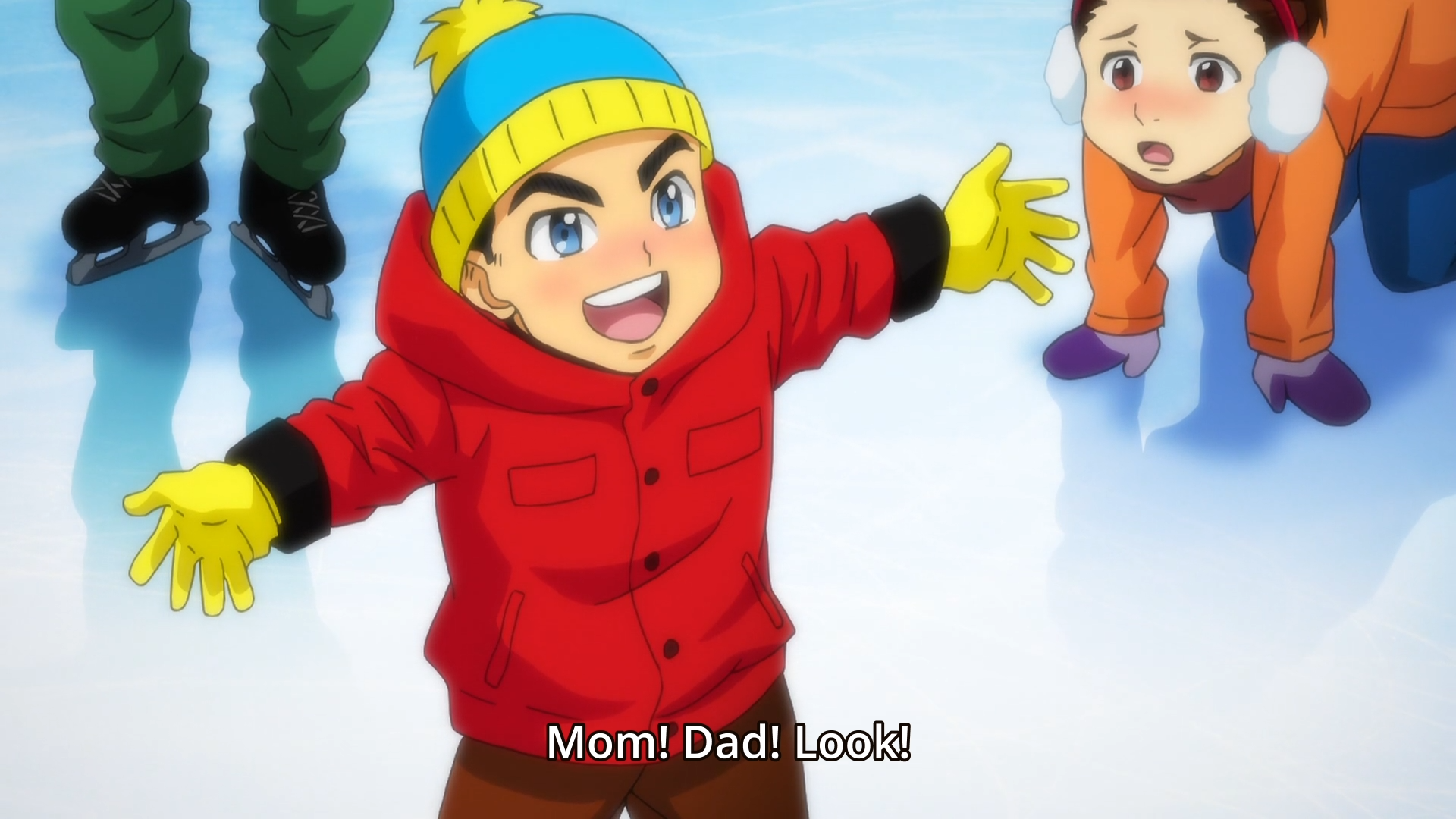 - Dans un flashback lors du 12e épisode, le patineur canadien Jean-Jacques "JJ" Leroy porte une tenue d'hiver inspirée du look signature d'Eric Cartman.
