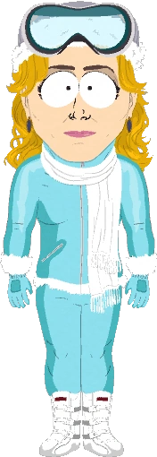 Natasha Richardson a de longs cheveux blonds ondulés. Elle porte une combinaison de ski turquoise avec une écharpe blanche, un bonnet de neige blanc et une paire de lunettes de ski.