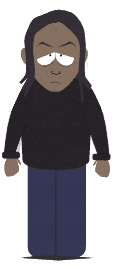長い黒髪を「コーンロウ[注 1]」と呼ばれるように細かく編み上げている。黒い長袖のシャツを着用しており、金色の丸い耳飾りを左耳につけている。