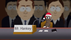 裁判所にて審問が始まると、ミスター・ハンキーはインターネットに投稿したつまらない文句よりも、クリスマスのイベントの方が大事だと訴える。しかし町長に向けて自分が 放ったひどい侮蔑の言葉を裁判官によって読み上げられると、ハンキーは途端に動揺してまたも暴言をまき散らした。