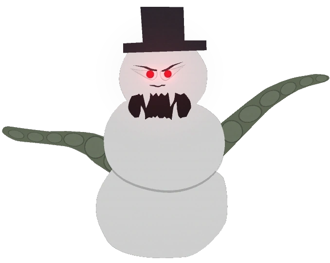 Jest bałwanem ulepionym z trzech kul. Ma kły i czerwone oczy. Na głowie nosi cylinder. Zamiast rąk ma macki.