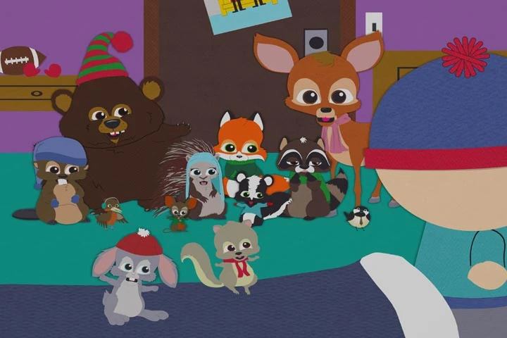 A cena da orgia de sangue e grande parte da violência exagerada do episódio foi inspirada em cenas semelhantes no filme O Enigma do Horizonte de 1997. Além disso, a cena da morte do leão da montanha é muito semelhante à queda de Mufasa de um penhasco em O Rei Leão. Stan tenta ignorar a insistência do Narrador para encontrar uma maneira de deter os Bichinhos da Floresta sentando-se em seu sofá e assistindo ao clássico programa de TV The Jeffersons. O narrador que ouvimos parece bastante semelhante às narrações ouvidas em muitos especiais de TV do Dr. Suess - mais notavelmente, Como o Grinch roubou o Natal. Além disso, a montanha escarpada da morte onde vive o leão da montanha lembra a caverna do Grinch, bem como a do Abominável Homem das Neves do clássico especial de TV de 1964, Rudolph, a Rena do Nariz Vermelho.
