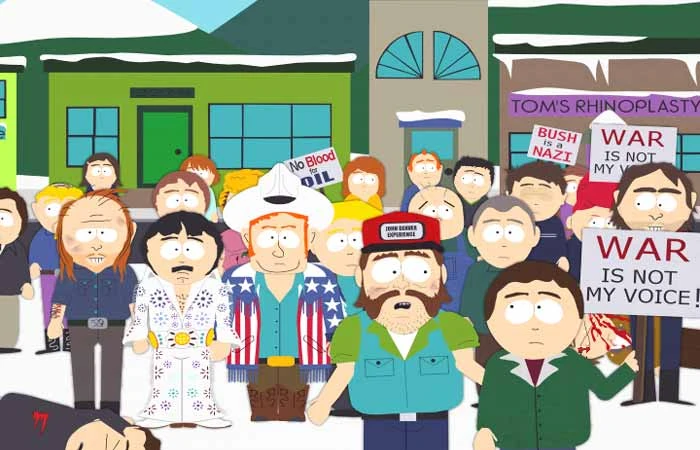 Benjamin Franklin aparece e anuncia que acredita que o novo país não deve parecer um guerreiro para o resto do mundo, mas, ao mesmo tempo, não pode parecer fraco. Portanto, deve ir para a guerra, mas permitir os protestos. Os Estados Unidos irão à guerra por um lado e usarão o protesto para se opor à guerra, por outro. Ele se refere a isso como " dizer uma coisa e fazer outra ". No comício, ambos os lados decidem usar os meninos para dar sua opinião sobre a guerra, mas o tiro sai pela culatra porque seus pais interferiram em sua tarefa sobre os Pais Fundadores, os meninos não sabem o que está acontecendo sobre a guerra e Cartman acabou no hospital; logo depois, Cartman acorda e passa sua mensagem para a cidade, que vê a verdade daquela afirmação e então começa a cantar. Nela, eles celebram suas diferenças e suas conquistas. |
