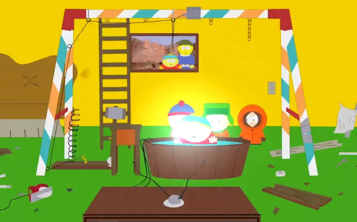 Enquanto isso, a população da cidade está dividida sobre a guerra e, depois de se dividir em duas, as duas planejam comícios: um pró-guerra, um anti-guerra, ambos no mesmo dia no mesmo lugar. Eles acabam tendo uma grande discussão, e no final entram em uma grande briga onde começam a se matar. Stan , Kyle, e Kenny começam a estudar para o projeto, mas Cartman decide adotar uma abordagem diferente. Em vez de apenas fazer o trabalho, ele desenvolve uma nova técnica de "pesquisa". Ele carrega seu sistema de gravação de TV com 50 horas de documentários do History Channel, em seguida, joga dentro de uma banheira com ele dentro, provocando uma eletrocussão - e um flashback de 1776. |