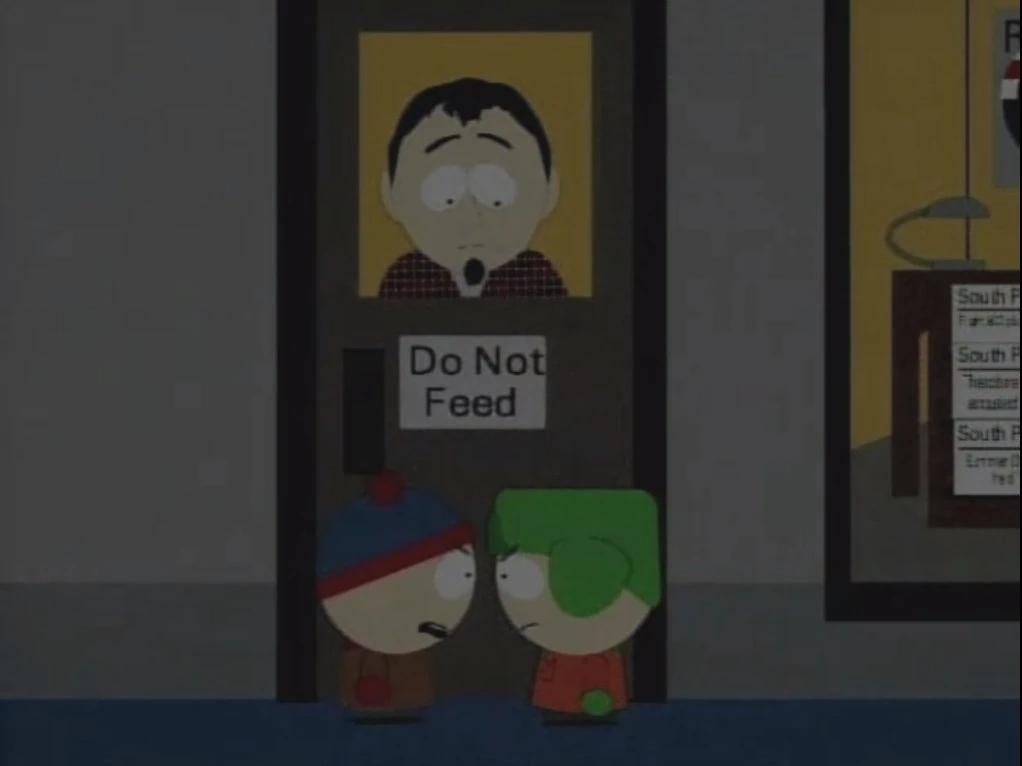 Preso na correia transportadora na frente do homem pré-histórico para exposições. Stan diz a primeira linha, como de costume, mas o Kyle não dizer a sua linha e, em vez diz: "O quê? Não estou falando com você", uma vez que eles estão brigados.