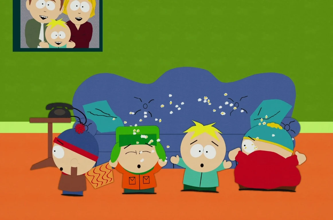 Os meninos estão perdidos sem ter para onde ir e o último intervalo comercial será exibido em alguns segundos a partir de agora. A única opção que resta é a casa de Butters, mas Butters diz que eles não pode ser na sua casa. Os meninos finalmente perguntam por que: seus pais não estão e ele não tem uma babá para cuidar dele. Os outros estão bravos porque a TV de Butters ainda está em sua casa sem ninguém nela e ele não contou a eles ("Podemos matar Butters mais tarde", diz Stan). Eles chegam na casa do Butters bem a tempo de ver o último intervalo comercial com o novo trailer do filme de Terrance e Philip. O trailer acaba sendo um teaser incrivelmente vago consistindo em nada além de um texto ambíguo e uma cena dos dois peidando vestidos como cowboys. Isso não impede que os meninos fiquem em êxtase por terem visto. Eles descobrem que Clyde gravou o trailer. Os meninos vão embora antes do final do show de Russell Crowe ser visto. Enquanto isso, a TV do Chef ainda está agitada e Chef ainda está tentando desligá-la com o Atendimento ao Cliente. |