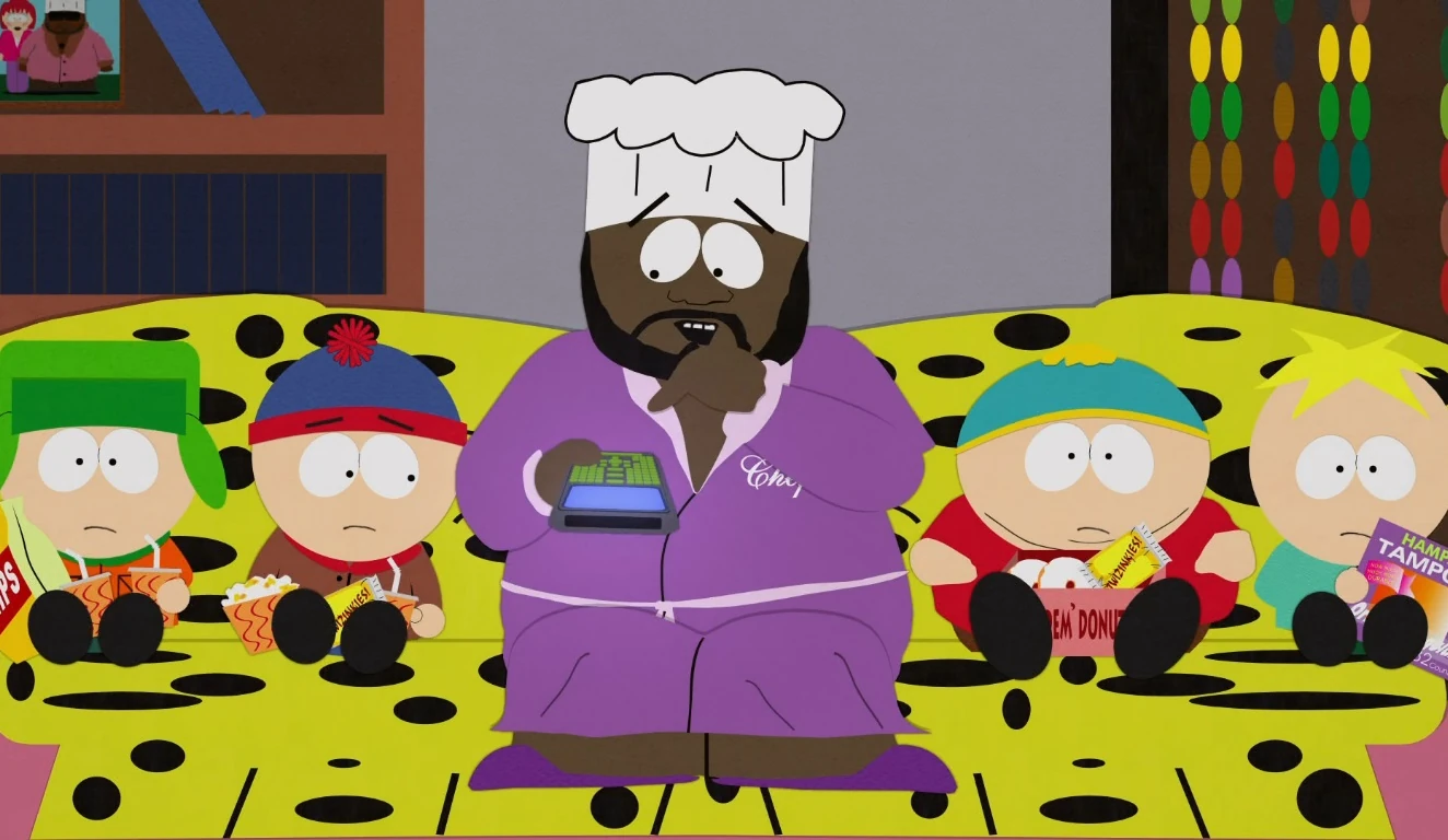 Como os meninos não podem ir à casa de Butters ou Cartman, eles vão para casa do Chef para assistir em sua nova TV de plasma com alto-falantes laterais e decodificador de cabo e uma base bastante grande. Os meninos chegam ao Chef bem a tempo de assistir ao primeiro intervalo comercial. Para sua decepção, o trailer não é mostrado durante esse intervalo. Enquanto continua a assistir Russell Crowe espancando afro-americanos e porto-riquenhos no meio de um jogo de basquete em Brooklyn, Chef tenta mostrar aos meninos os recursos de sua TV. Ele explica que sua TV tem a capacidade de reproduzir 3 canais ao mesmo tempo. Infelizmente, ele não consegue descobrir como usar o controle remoto complexo e acaba ativando inadvertidamente o modo "MEH" que acaba sendo um acrônimo para "Modo de Erradicação Humana" e a TV se transforma em um ED-209-como máquina. A TV do Chef sai da parede para causar assassinatos na rua, disparando lasers contra os transeuntes e carros. Os meninos deixam o Chef resolver seu problema e vão até o bar para ver a TV de lá. |