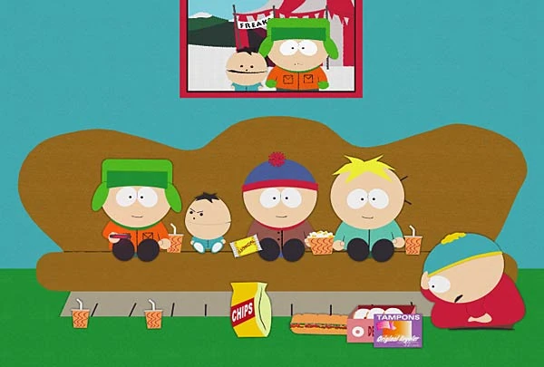 Mas há um problema: Butters nunca entregou os absorventes, o que significa que Shelly não conseguiu usá-los. Assim que Stan gira a maçaneta da porta da frente, a porta se abre e uma torrente de sangue jorra pela porta, inundando os meninos de volta para a rua. Com todas as outras opções impossíveis, eles veem alguns viciados em crack na rua com uma pequena TV e se juntam a eles para assistir Russell Crowe que a tentativa de suicídio de Tugger o fez perceber que deveria defender uma causa e de agora em diante, vai passar todo o tempo livre lutando contra o câncer. Ele não conseguiu encontrar o câncer para lutar, mas encontrou um homem com câncer e começa a bater nele. O homem é magro como um raio e conectado a um tubo intravenoso ou a um tanque de oxigênio. O programa é interrompido pela TV do Chef atirando na pequena TV e matando um dos viciados em crack. Chef está ainda falando com o Atendimento ao Cliente. |