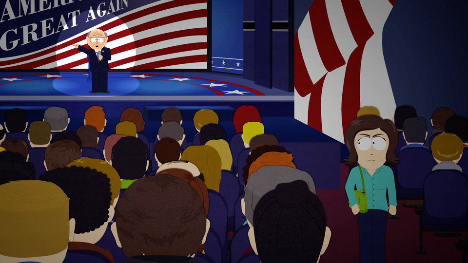Garrison is then shown meeting with his campaign advisers, who are questioning the recent comments he made about women at his speech. As Garrison acts as if nothing is happening, his supporters are outside demanding answers. He comes out and says that the election was rigged against him from the start. The supporters become angry and start to chase him.