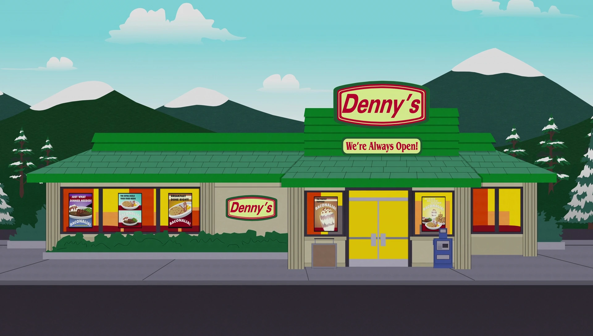 Denny's is a real restaurant chain featured in South Park. Its first appearance is in the Season Fifteen episode, "Crack Baby Athletic Association".