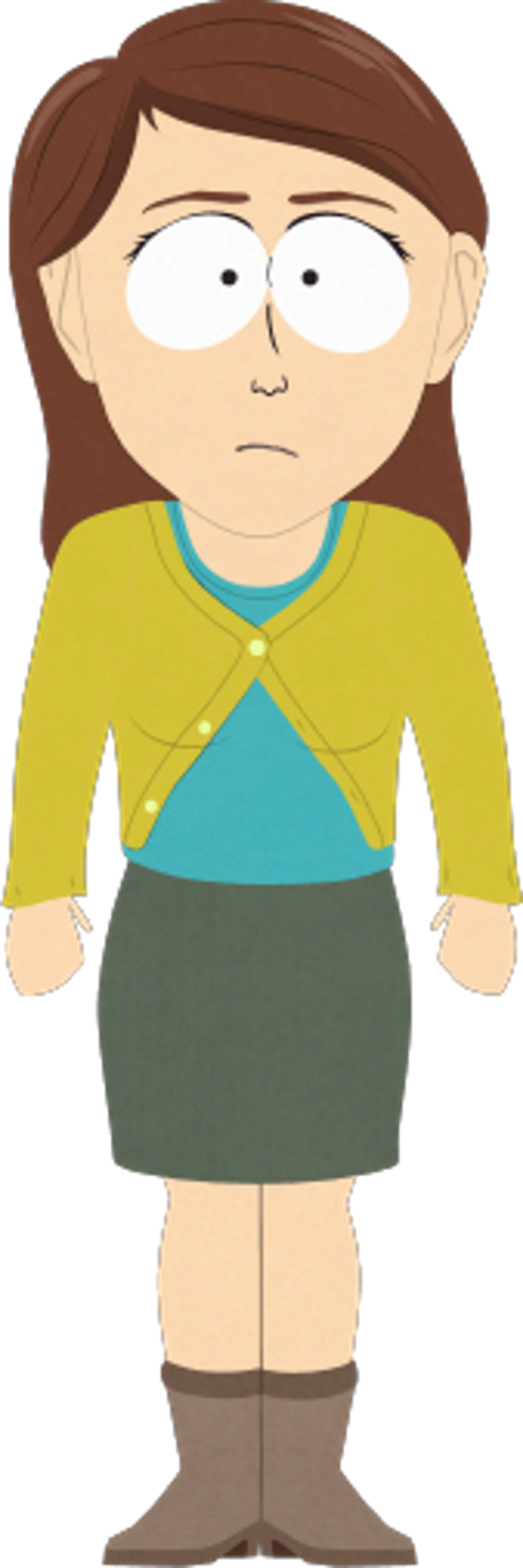 Though she does not have a speaking role, she can be seen walking on the streets of South Park, waiting in line with her husband at the Unplanned Parenthood Clinic during the quest Farts of Future Past, drunk in front of the garage of the Stevens Residence, drunk in Crunchy's Micro Brew during Mitch Conner's inauguration, and can sometimes be spotted in the bank.