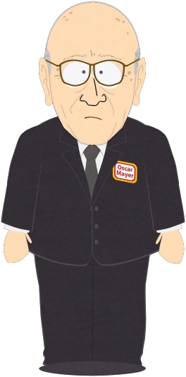 Oscar Mayer Jr. has severely balding gray hair. He wears a black business suit with the "Oscar Mayer" logo printed on the left side of the chest.