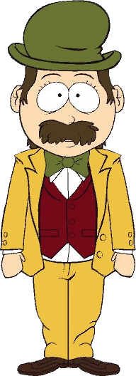 Pityef has short brown hair, brown eyebrows, and a large bushy brown mustache. He wears a navy green hat, a navy green bowtie, a yellow jacket over a red vest and a white shirt, yellow pants, and brown shoes. In the Dr. Suess style, his appearance remains the same, but the outlines on his body are thicker.