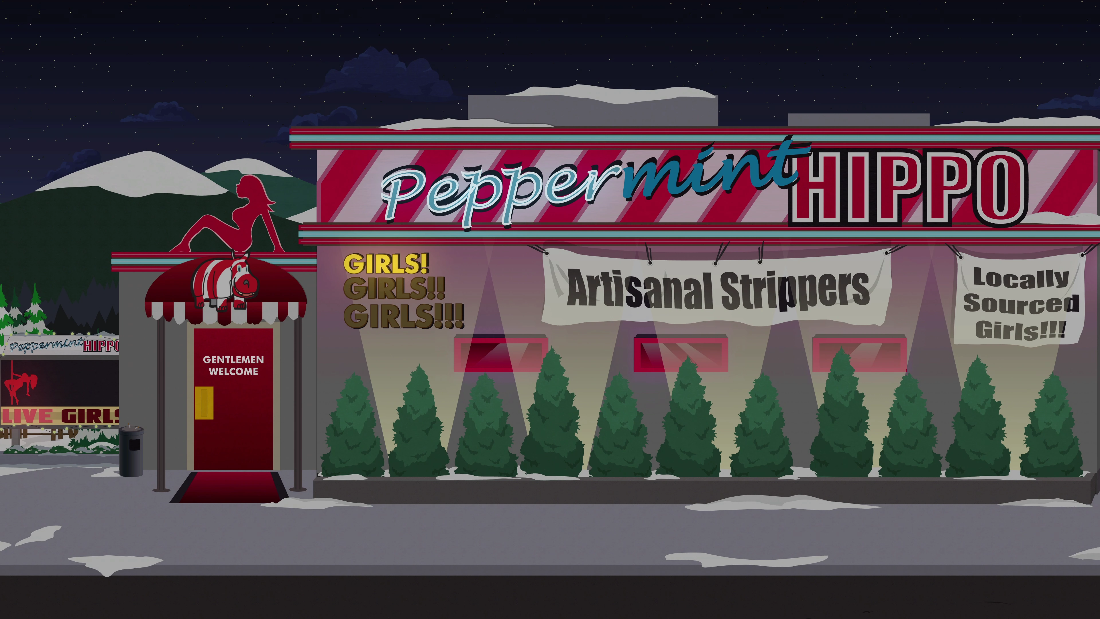 The Peppermint Hippo is a strip club located in South Park, appearing in "Lil' Crime Stoppers", "The Return of Chef", and South Park: The Fractured But Whole.