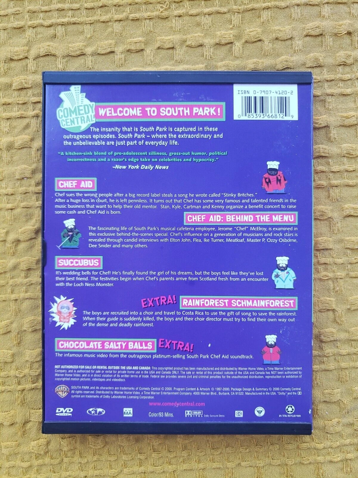 The front cover shows the boys with Chef, the funny thing is that the cover is from a collector's edition of the album "Chef Aid". The spine come out the boys and the South Park logo. The back shows the episodes and extras and a text from the New York Daily News. The Left Hub is the cover of the CD Single Chocolate Salty Balls.