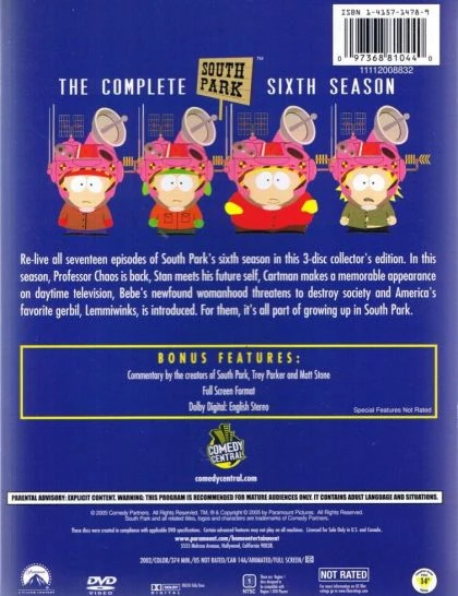 South Park: The Complete Sixth Season is a 2005 DVD release of Season Six, including all seventeen episodes from the season and featuring audio mini-commentaries by Trey Parker and Matt Stone. The Blu-ray boxset containing the re-rendered episodes was released on December 19, 2017.