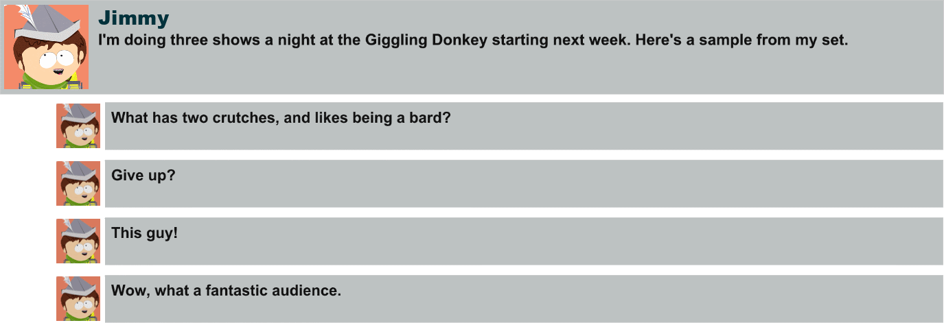 - It is revealed in The Bard's Facebook messages that he performs at the Inn of the Giggling Donkey.