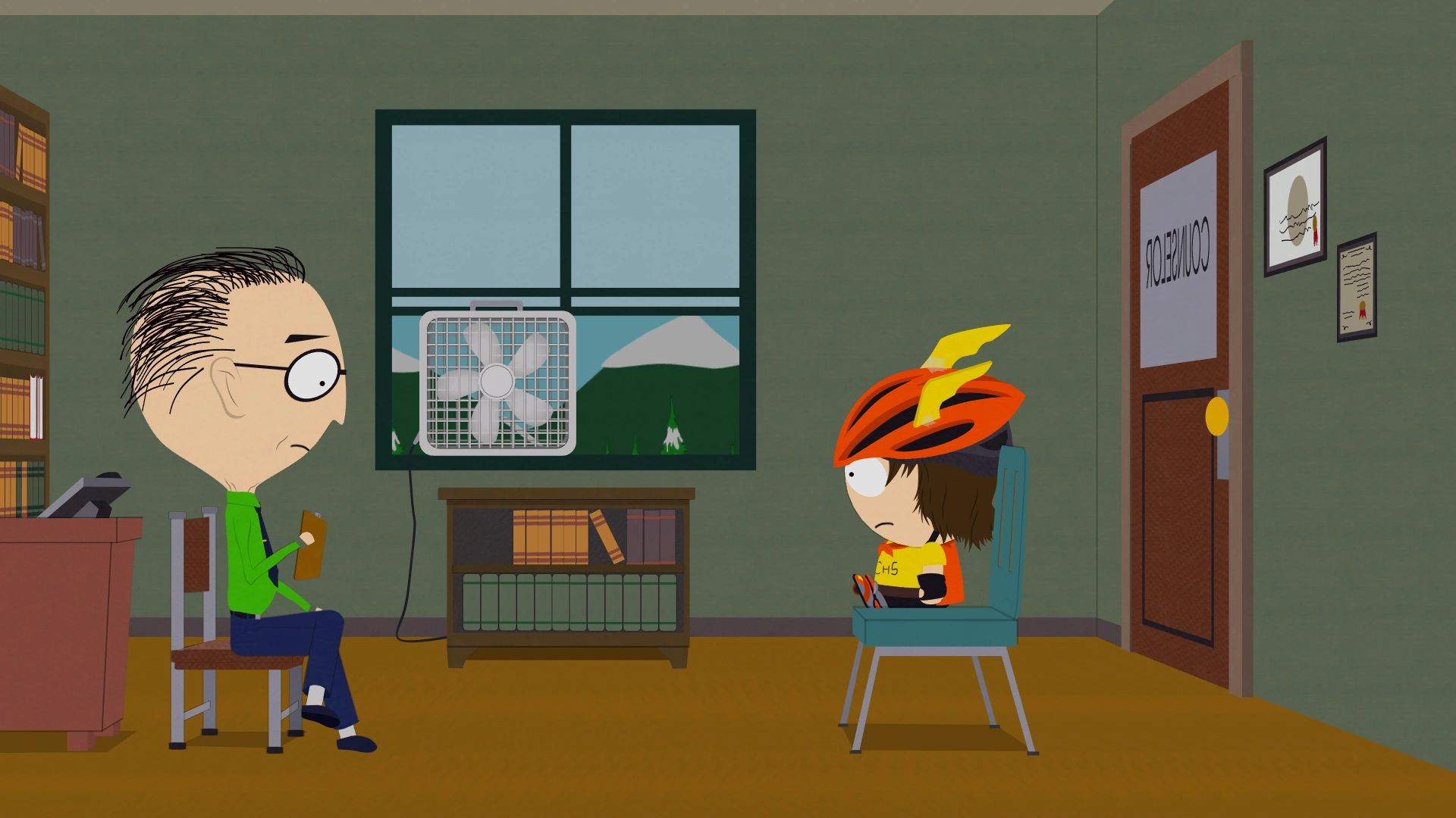 The New Kid makes their way from the South Park Church to the counselor's office in South Park Elementary. There, Mr. Mackey discusses with the New Kid on the sex/gender that they identify with. When the New Kid makes their choices, Mr. Mackey phones their parents to verify their identity. Mr. Mackey then thanks the New Kid for their time, but cautions them that, "there's a lot of people out there who don't accept you for what you are and you're gonna have to deal with them."