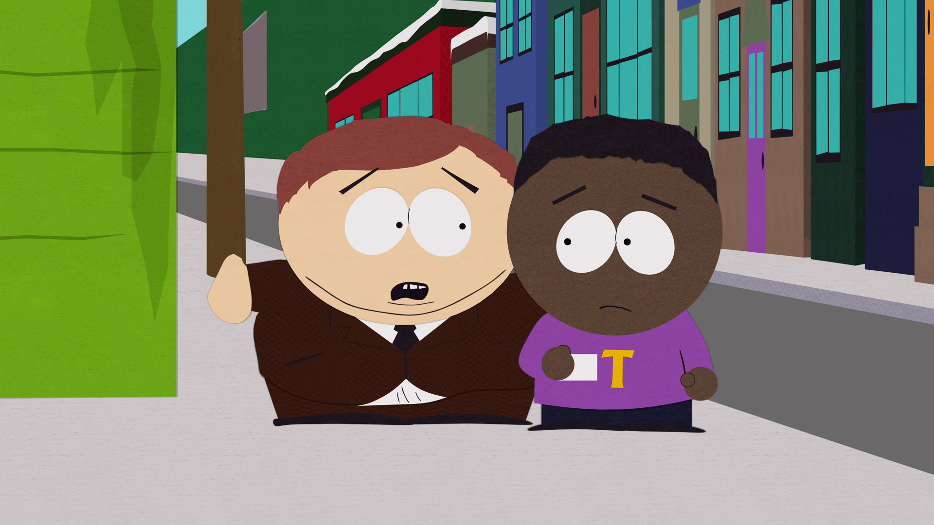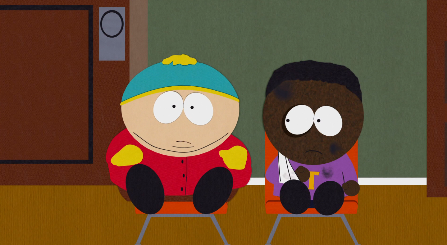 In "1%", Cartman stays at Tolkien's house to hide from whoever is killing his dolls, convinced that since Tolkien is black, no one would dare attack him there because it would supposedly be a sign of racism.