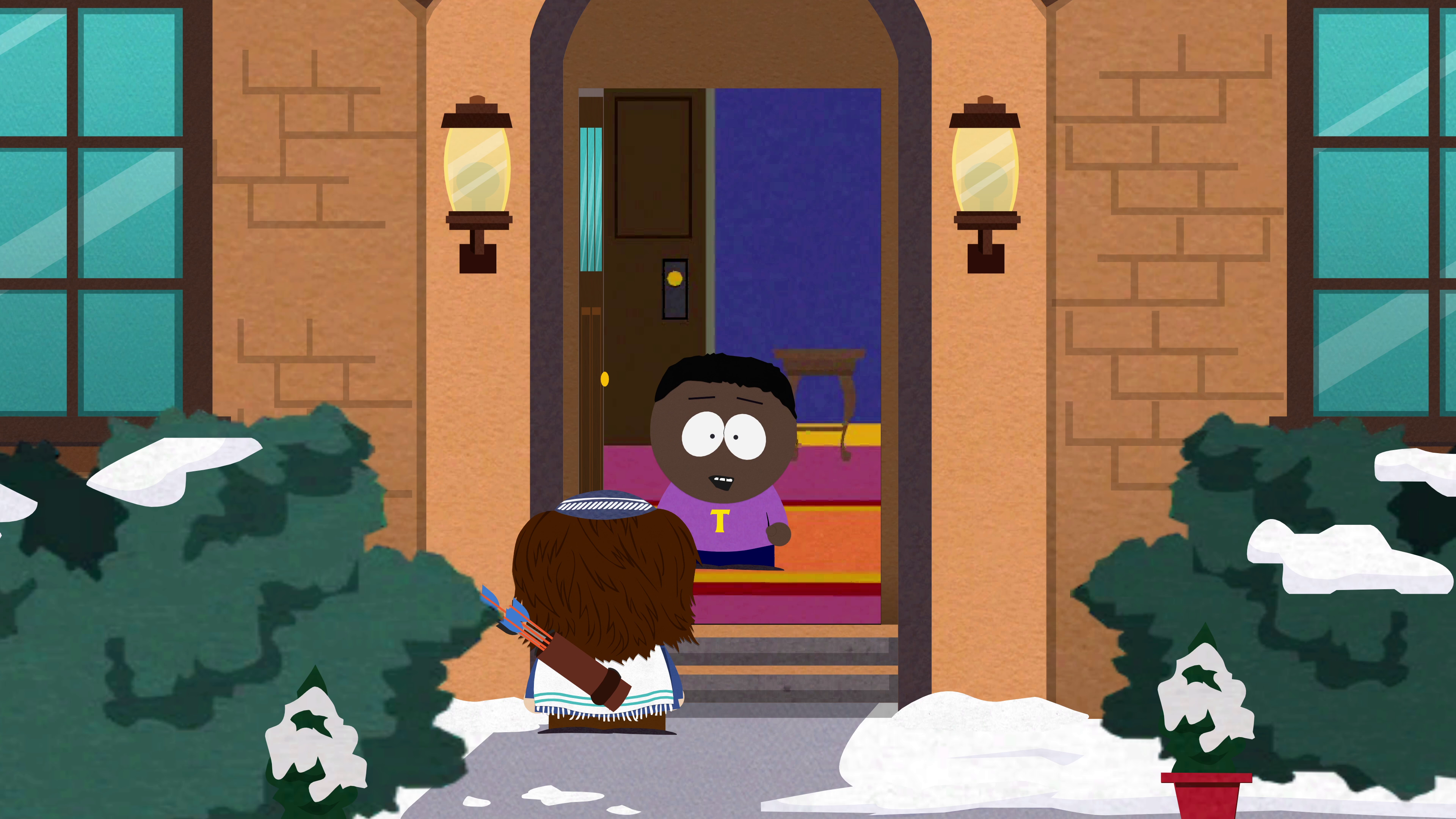 "Stunning and Brave" - Mr. Mackey tells PC Principal that Tolkien is a minority at South Park Elementary, which earns him detention. He is with the boys watching Cartman attempt to blackmail PC Principal, but bails upon seeing him get beat up.